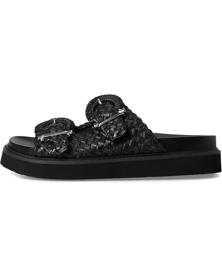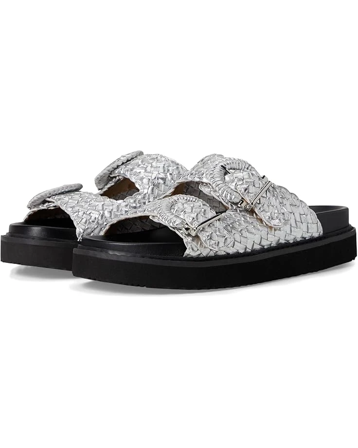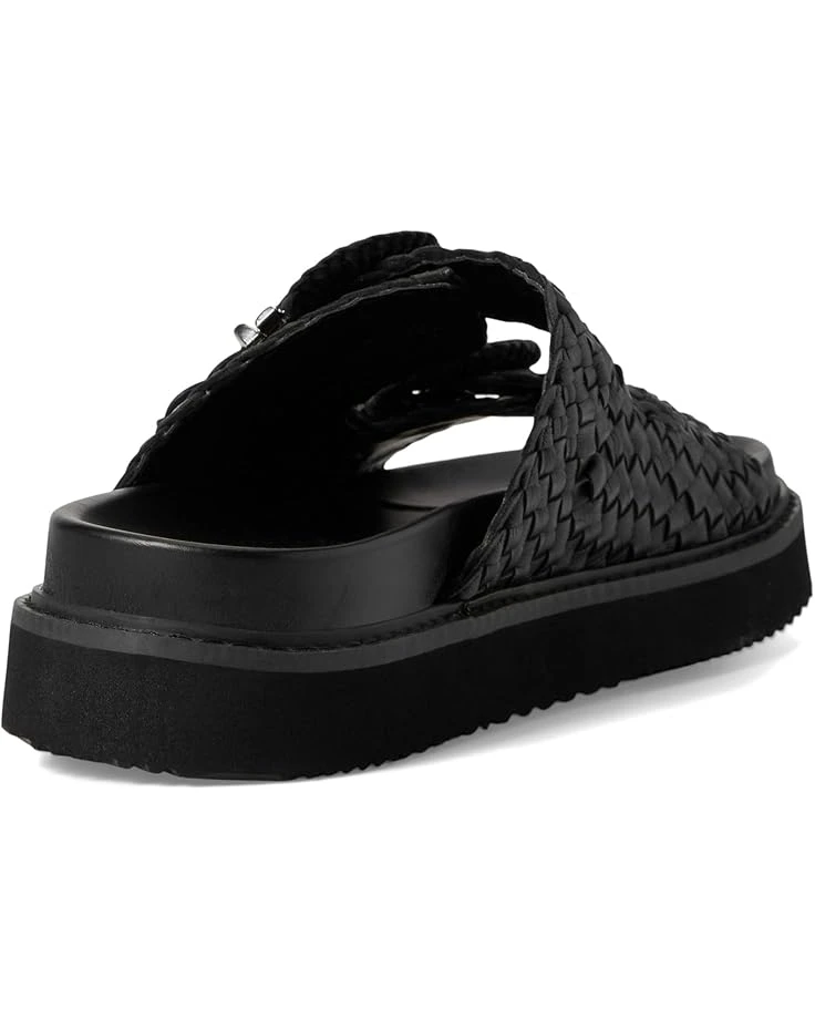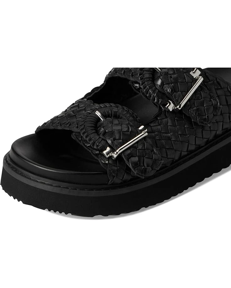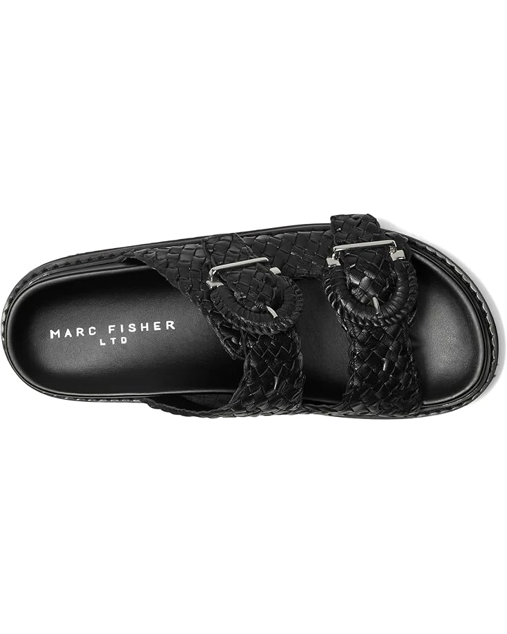- Add glam to your casual look wearing Marc Fisher LTD™ Auggie Sandals. These feature a woven detailing, slip-on design, and two buckled straps along with an open round toe shape. The sandals are crafted with a leather upper and man made lining.